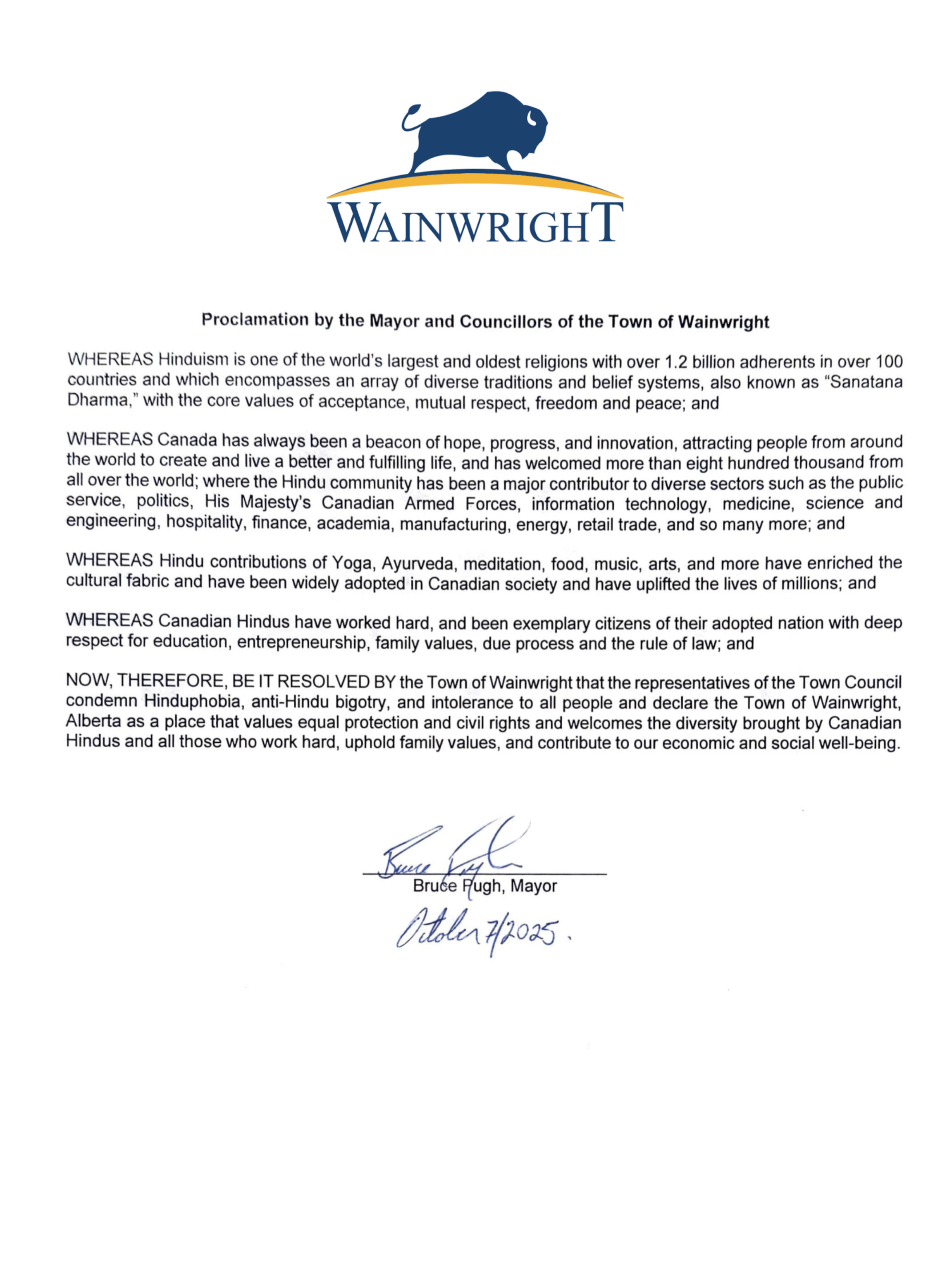 “Canada’s Hindu community has long exemplified the values of hard work, family, education, and respect for the rule of law,” the proclamation notes, calling Wainwright “a town that welcomes diversity and stands firmly against all forms of hate and discrimination.”