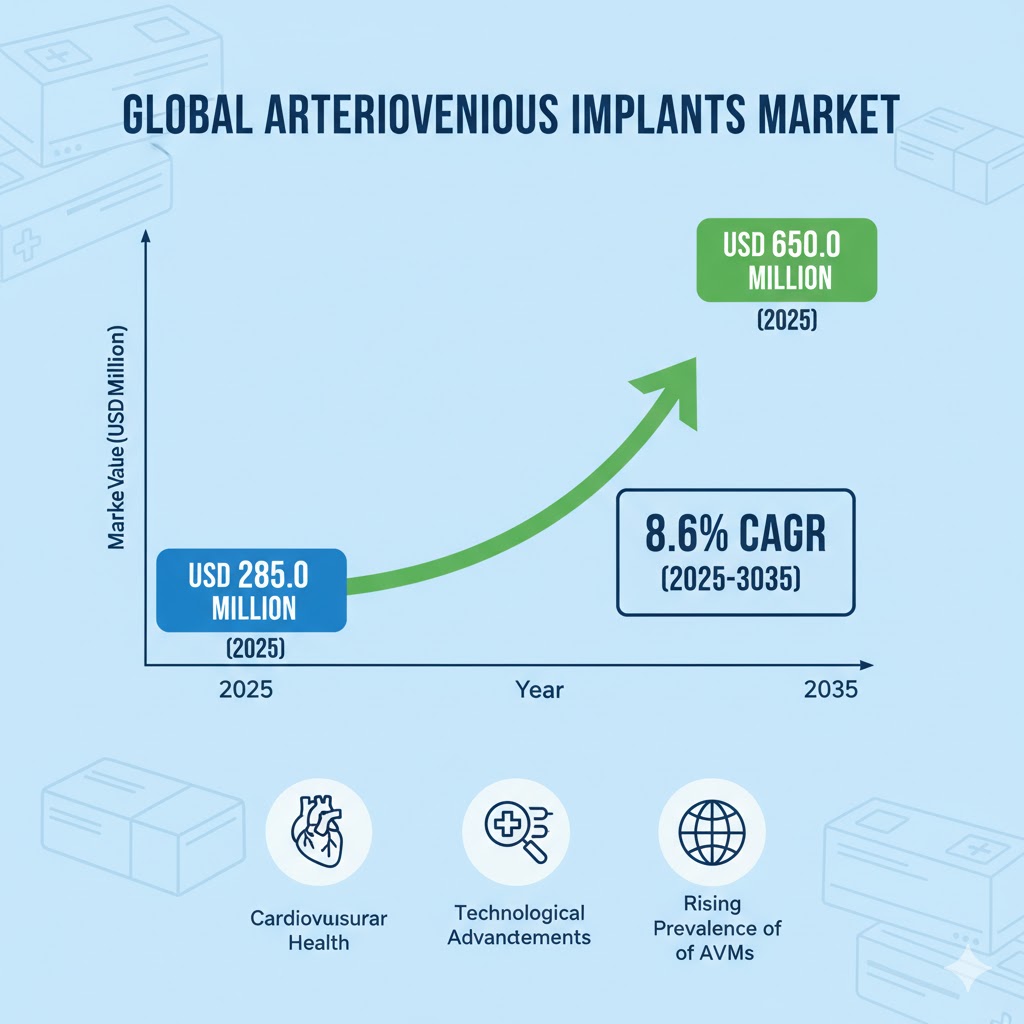 ROCKVILLE, MD, UNITED STATES, October 10, 2025 /EINPresswire.com/ -- The global arteriovenous implants market is gaining remarkable traction as chronic kidney disease and end-stage renal disease (ESRD) cases surge worldwide. According to a recent study by Fact.MR, the market is projected to grow from USD 285.0 million in 2025 to approximately USD 650.0 million by 2035, recording an absolute increase of USD 365.0 million over the forecast period. This reflects a robust compound annual growth rate (CAGR) of 8.6% from 2025 to 2035.