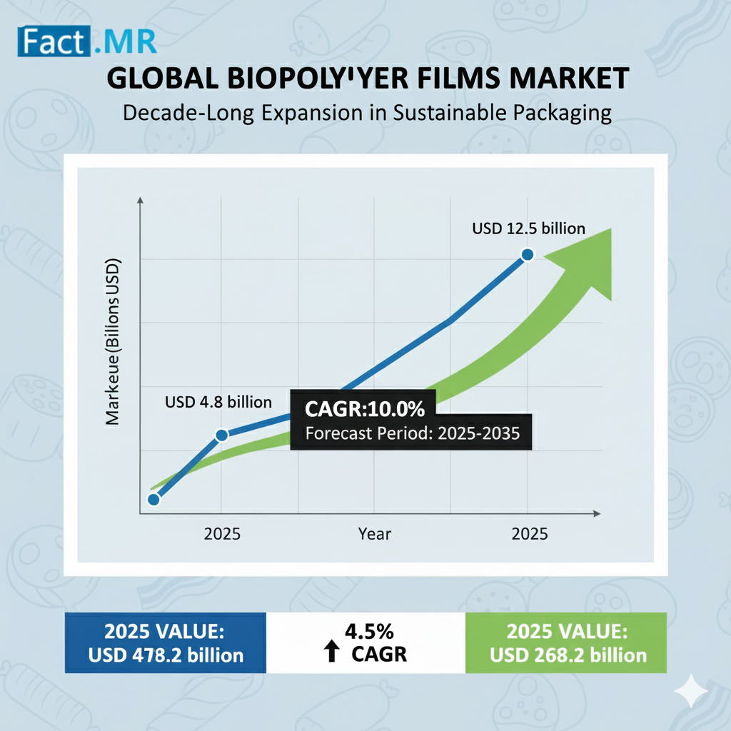 MD, UNITED STATES, October 13, 2025 /EINPresswire.com/ -- global biopolymer films market is on the cusp of a transformative decade, projected to grow from USD 4.8 billion in 2025 to an impressive USD 12.5 billion by 2035, registering a robust CAGR of 10.0%. According to Fact.MR’s comprehensive forecast, this expansion underscores the pivotal role biopolymer films are playing in reshaping the future of sustainable packaging, biodegradable materials, and circular economy adoption worldwide.