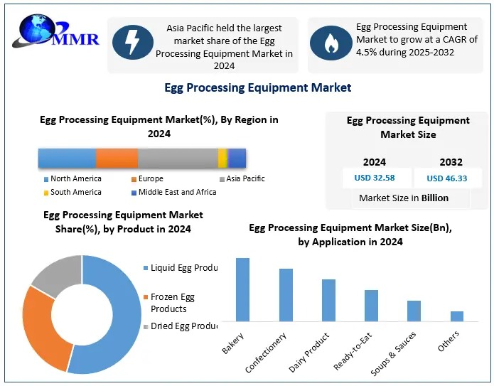 WILMINGTON, DE, UNITED STATES, October 13, 2025 /EINPresswire.com/ -- Global Egg Processing Equipment Market was valued at USD 32.58 billion in 2024 and is projected to reach USD 46.33 billion by 2032, growing at a CAGR of 4.5% during the forecast period (2025โ2032).— Dharti Raut