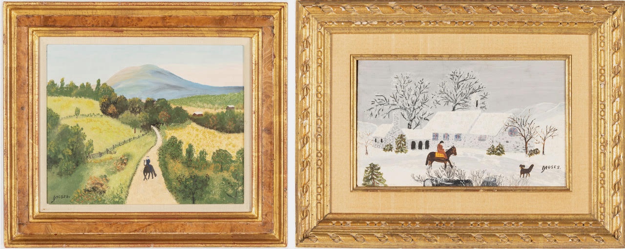 Grandma Moses oil-on-Masonite paintings, L to R: 'The Country Road' and 'No Game.' Artist-signed. Both appear in 1973 Kallir reference 'Grandma Moses.' Estimate: $8,000-$12,000 each. Photo copyright Grandma Moses Properties Co., New York