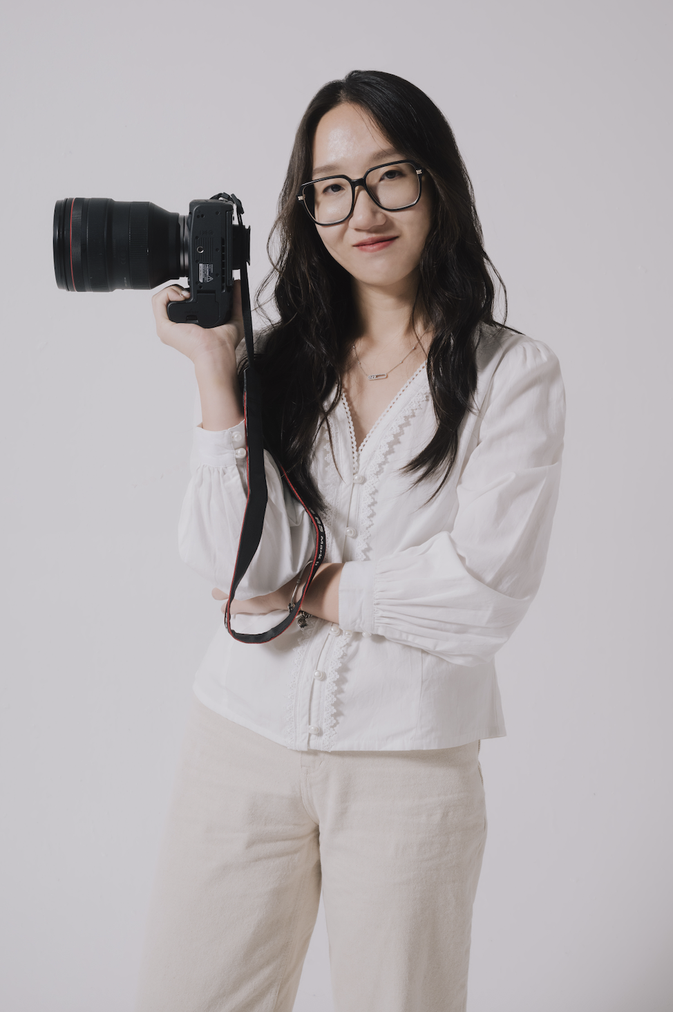 Audrey Tjahjono holding a camera, wearing glasses, a white long-sleeved shirt, and matching white pants. Audrey has long hair down and stands confidently, ready to capture photos.