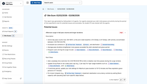 Site scan provides automated weekly reviews of hallway activity and configuration settings. Acting like a team of AI detectives, the system identifies anomalies and launches parallel investigations to uncover root causes, such as a sudden increase in bathroom passes. It then recommends actions to help prevent or reduce those patterns. Each week, site scan analyzes the previous week’s data across the entire site, formalizing findings into an easy-to-digest report that prioritizes potential risks and recommends specific, actionable steps administrators can take to improve safety and policy enforcement.