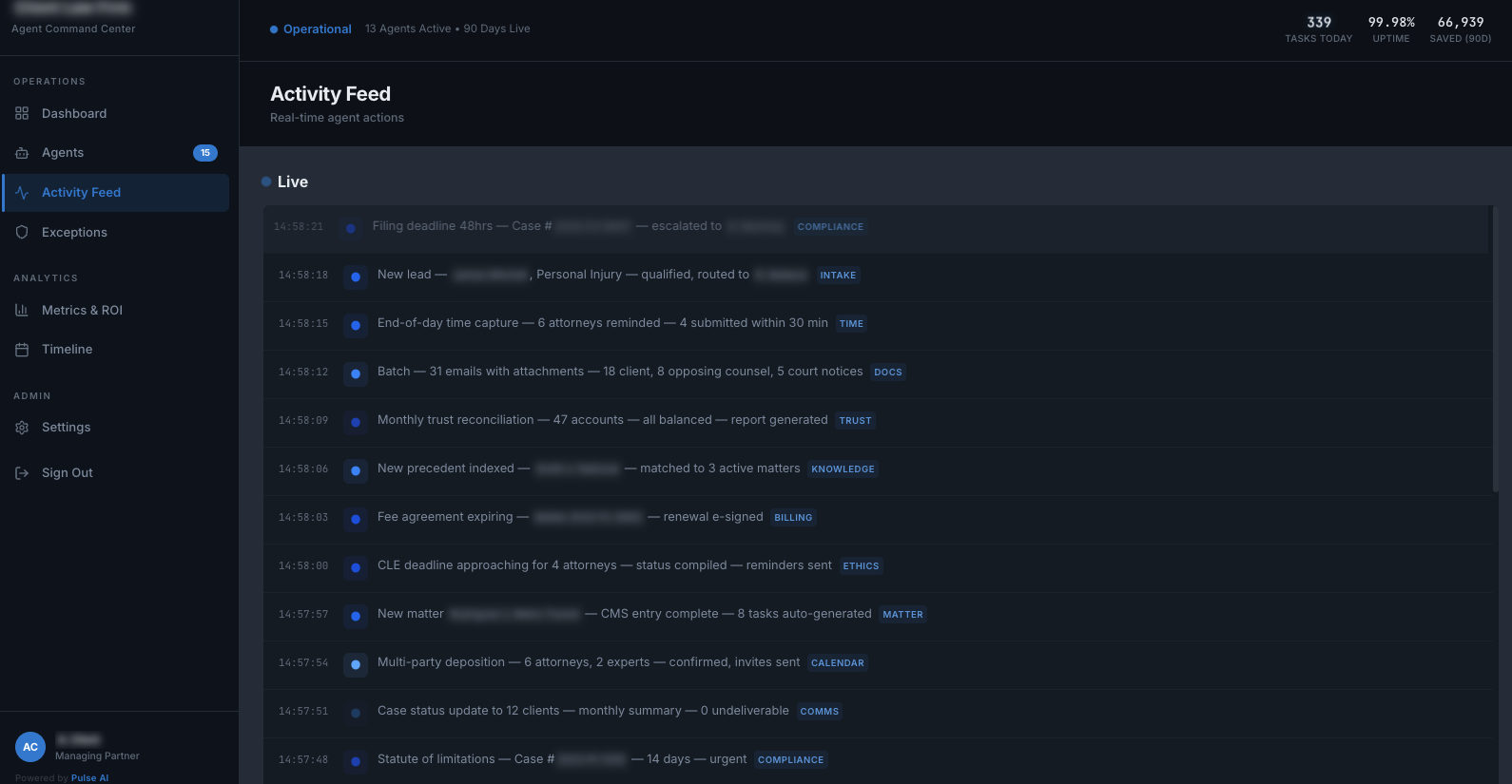 The agents handled 345 operational exceptions over the 90-day period. Of those, 330 were auto-resolved without human intervention. Only 15 required escalation to a human operator. Average exception resolution time was 6 minutes. Exception types ranged from conflict of interest catches during client intake to trust account deposit discrepancies, court deadline changes requiring cascading updates across linked matters, e-filing format rejections requiring auto-correction and resubmission, and billing rate changes mid-matter flagged for partner approval.