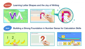 The curriculum covers seven subject areas: Alphabet, Math, ELA, Science, Social Skills, Thinking Skills, and Art & Music. In literacy, children start with basic strokes – straight lines, curves – before progressing to full letters, guided by on-screen animations that show proper stroke direction. In math, the focus is number sense: counting, ordering, and writing numerals through hands-on screen interaction meant to build the foundation for later arithmetic.